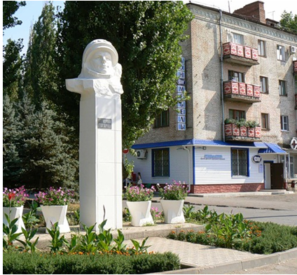 Автор памятника Павел Кочетков. Каменный бюст. Установлен 12 апреля 1972 года. На мемориальной доске имя великого летчика – космонавта.