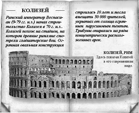 У 70 – 80 р. н. е. був споруджений грандіозний амфітеатр Флавіїв, що одержав назву Колізей (від латинського colosseus – “величезний”). Він вибудований на місці зруйнованого Золотого будинку Нерона і належав до нового архітектурного типу будинків. У Греції колись були тільки театри, що влаштовували на природних схилах пагорбів і полів. Римський Колізей являв собою величезну чашу зі східчастими рядами сидінь, (замкнуту зовні кільцевою елипсовидною стіною. В амфітеатрах давали різні вистави: морські бої (навмахії), бої людей з екзотичними звіринами, бої гладіаторів. У сонячні дні над Колізеєм натягали величезний парусиновий навіс – велум, чи веларій.