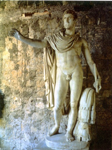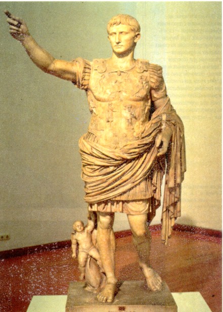 слабого здоровья и часто кутался в тёплые одеяния, но изображали его могучим и мужественным. Известная статуя из Прима Порта представляет его оратором, обращающимся к народу. Август облачён в одеяние императора: богато украшенный панцирь (на котором в обрамлении богов, небес и преисподней парфяне возвращают римлянам отнятые у них ранее знамена), тяжёлый, обёрнутый вокруг тела плащ, а в руке он держит императорский жезл. У его ног на дельфине сидит крошечный Амур, сын Венеры — по преданию, прародительницы Юлиев. Статуя величава и торжественна. Особую приподнятость ей придают черты греческого стиля — босые ноги и непокрытая голова.