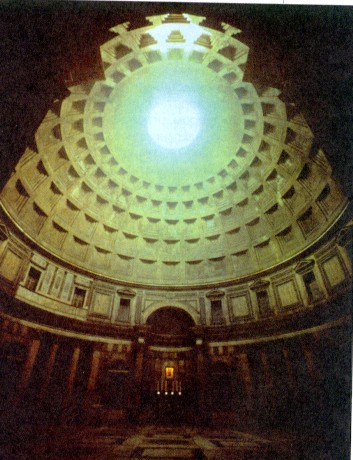 Снаружи он представляет собой огромный цилиндрический объём, к которому пристроен глубокий портик. Прежде в Пантеон входили через стоявшую на его площади триумфальную арку. Она была символическим знаком приобщения к божественному. Внутри же Пантеон совсем иной. Он имеет двухъярусную стену с колоннами и нишами, прорезанную сводчатыми арками. На втором, меньшем и более плоском ярусе стоит купол. Его мощь зрительно облегчают пять рядов перспективных кессонов (квадратных углублений) и верхний проём диаметром девять метров. Покой, внутреннюю гармонию, уход от земной суеты в мир духовности — вот что давал Пантеон посетителям.