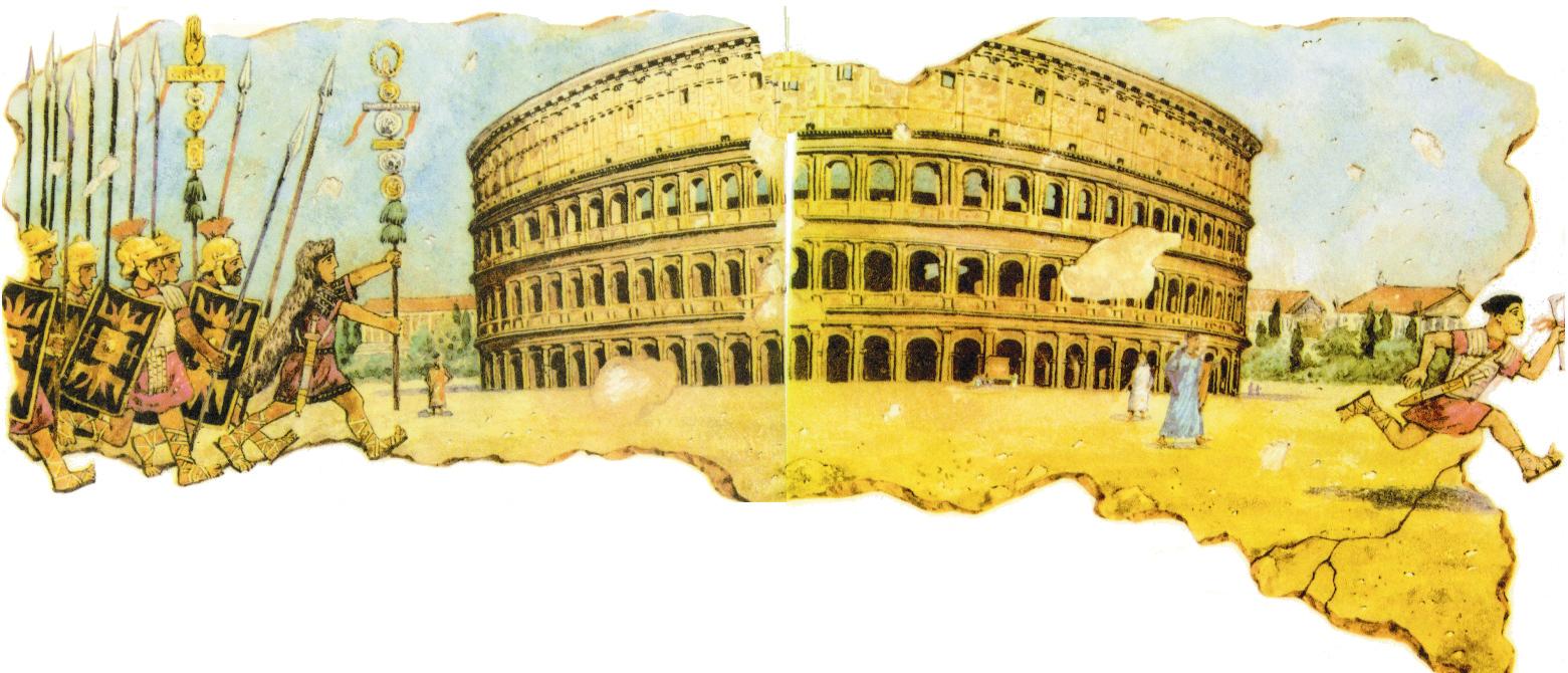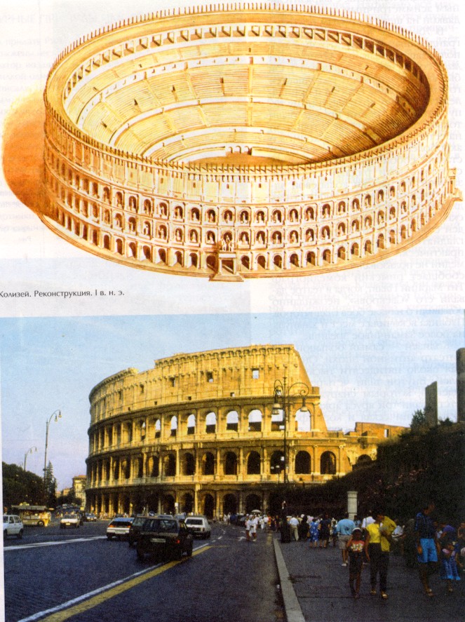 Колизей — самый большой амфитеатр античной эпохи. Он вмещал около пятидесяти тысяч зрителей. Внутри шли четыре яруса сидений, которым снаружи соответствовали три яруса аркад: дорическая, ионическая и коринфская. Четвёртый ярус был глухим, с коринфскими пилястрами — плоскими выступами на стене. В солнечные дни над Колизеем натягивали огромный парусиновый навес — велум, или веларий. Внутри Колизей очень конструктивен и органичен, целесообразность сочетается в нём с искусством: он воплощает образ мира и принципы жизни, которые сформировались у римлян к I в. н.э. Второй шедевр зодчества эпохи Флавиев — это знаменитая Триумфальная арка Тита. Тит, считавшийся здравомыслящим и исполненным благородства императором, правил сравнительно недолго (79— 81 гг.). Арку воздвигли в честь правителя в 81 г., уже после его смерти. Она увековечила поход Тита в 70 г. на Иерусалим и разграбление там храма Соломона.