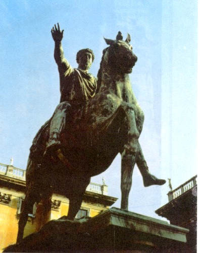 Конная бронзовая статуя Марка Аврелия уцелела до наших дней. Статуя выполнена по древней античной схеме, но облик всадника не гармонирует ни с конём, ни с миссией воителя. Лицо у императора отрешённое и самоуглублённое. Марк Аврелий думает не о военных победах — их у него было немного, — а о проблемах мира, человеческой души. Скульптурный портрет того времени приобретает особую духовность. Со времён Адриана сохранилась традиция изображать лицо в обрамлении пышных волос. При Марке Аврелии ваятели достигли особой виртуозности. Они высверливали каждую прядь, соединяя её мостиками с другими, в мостиках дополнительно углубляли каналы. Свет дробился в волосах, создавая богатую игру светотени. Однако особое внимание стали уделять глазам: их изображали подчёркнуто большими, с тяжёлыми, как бы припухшими веками и поднятыми вверх зрачками. Создавалось впечатление печальной усталости, разочарованности в земной жизни и ухода в себя. Так в эпоху Антонинов изображали всех, даже детей.