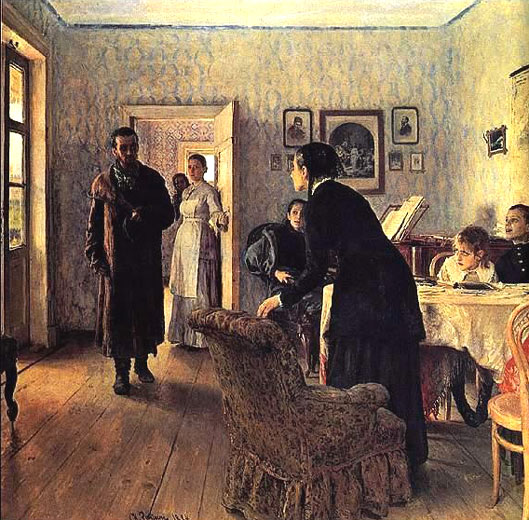 Самым значительным произведением на революционную тематику стало полотно «Не ждали» (приложение № 6). Художник изобразил революционера, возвратившегося в родной дом из ссылки. Его неловкая поза, ожидание, застывшее в глазах, свидетельствующих о неуверенности, даже страхе: узнает ли его семья, примут ли отца, отсутствующего много лет, его дети? Репину удалось мастерски передать всю сложную гамму чувств, отраженных на лицах революционера и членов его семьи. Испуганно смотрит на незнакомого мужчину девочка (когда его забрали, она была слишком мала и потому забыла своего отца), изумлением полны глаза жены, сидящей у рояля. А на лице мальчика - радостная улыбка, говорящая о том, что ребенок догадался, кто стоит перед ним.
