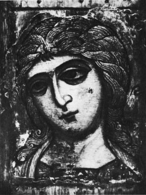 Тонкое изможденное лицо Иоанна Златоуста (мастера проповеднической прозы IV века) с впалыми щеками и огромным лбом, словно иссушено напряженной работой мысли. Рядом с ним — Василий Великий (оратор, писатель, дипломат IV века) с упрямой складкой губ и крупными характерными чертами — образ человека, менее утонченного, но зато более сильного, более способного к действию, что очень точно подтверждает его активная и многогранная деятельность. Если по подбору сюжетов мозаики Софии весьма точно следуют схеме, принятой в Константинополе, то во ; фресках гораздо больше свободы и в выборе 'сюжетов, и в их иконографии, и в художественном решении. Еще больше местных черт в единоличных изображениях, которыми изобилует храм. В ряде случаев встречается славянский тип лиц — широких, округлых, со смягченным рисунком черт. Попадаются и славянские надписи.