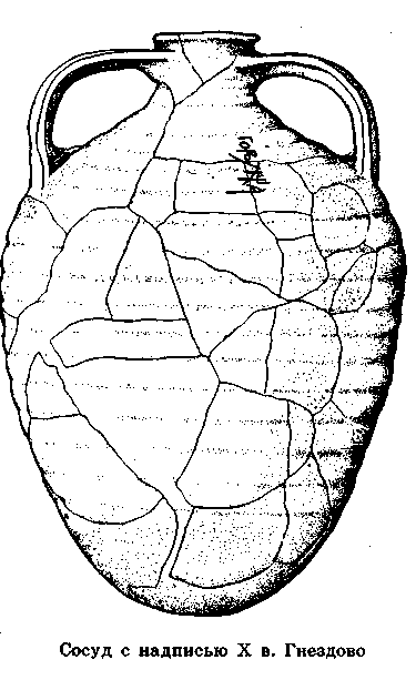 Но особый интерес для решения вопроса о древнерусской письменности имеет находка, сделанная советским археологом Д.А.Авдусиным во время раскопок так называемых Гнездовских курганов под Смоленском. На глиняном сосуде типа амфоры первой четверти X в. рукой русского человека кирилловским алфавитом сделана надпись. Она прочитывается и расшифровывается учеными по-разному. Одни считают, что написано «гороухща», другие читают, как «горушна». И в том, и в другом случае это слово означает горчичные семена, горькую пряность. Таким образом, перед нами сосуд для хранения или перевозки горчичного семени, пряности.