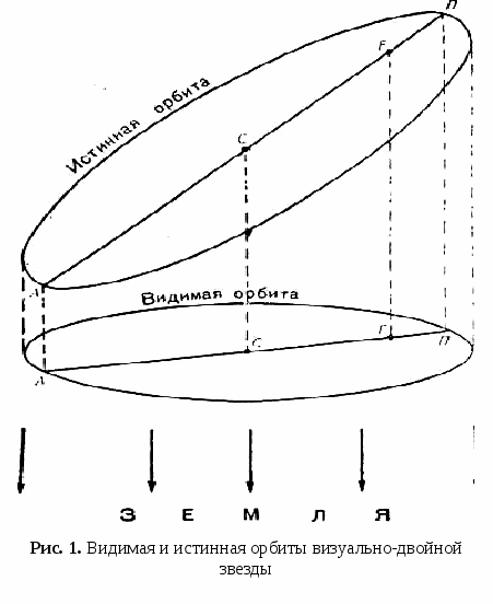 Видимые орбиты, спутников визуально-двойных звезд всегда имеют форму эллипса (рис. 1). Однако главная звезда обычно оказывается не в фокусе такого эллипса. Происходит это вследствие того, что истинная орбита спутника рассматривается земным наблюдателем наискось и видимая орбита представляет собой ее проекцию на плоскость, перпендикулярную к лучу зрения. И только в тех редких случаях, когда эта плоскость совпадает с плоскостью истинной орбиты, видимая и истинная орбиты тоже совпадают и главная звезда оказывается в фокусе видимой орбиты спутника.