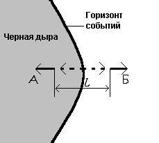 В вакууме постоянно рождаются и аннигилируют пары виртуальных частиц, которым, однако, не хватает энергии для превращения в реальные долгоживущие частицы. В достаточно сильном внешнем поле этот недостаток энергии может быть восполнен работой, производимой полем над частицами. Для появления реальной пары с энергией Е (сплошные линии) необходимо, чтобы ее компоненты, находясь еще в виртуальном состоянии (пунктир), разошлись на расстояние L, на котором работа поля равна Е. Одна из компонент пары (А) падает внутрь черной дыры, (Б) уходит наружу, к внешнему наблюдателю. Совокупность частиц Б и есть излучение Хокинга.