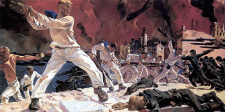 Крестьянка развешивает детские пеленки на стволе пушки подбитого «фердинанда»; старик, словно бессмертный, деловито косит рожь на заминированном поле. Это ведь не случайно А. Платонов заметил – здесь не упоение и наслаждение страданием, обессиливающим человека, здесь нечто другое: обыденное - на уровне естества – мужество, умение жить всякой жизнью как обыкновенной. Случаются катастрофы, которые нельзя победить сразу, но которые можно превозмочь терпением и страданием… Терпение и труд все перетрут, народом не праздно сказано.