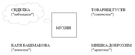 Мухину (почти что точке...) задана принципиально неразрешимая задача. Это - едва ли не воплощенная в конфликте двух типов художественного пространства задача о квадратуре круга. Он в равной степени принадлежит как округлому и ярусному пространству природы, так и квадратному - советского социума, но принадлежать и тому и другому одновременно невозможно.