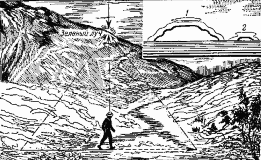 Длительное наблюдение "зеленого луча"; наблюдатель видел "зелёный луч" за горным хребтом в течение 5 минут. Выше справа - зелёный луч, видимый в подзорную трубу. Диск Солнца имеет неправильные контуры. В положении 1 блеск солнечного диска ослепляет глаз и мешает видеть зелёную каёмку простым глазом. В положении 2, когда диск Солнца почти исчезает, "зелёный луч" становится доступным простому глазу. (Рис. 119, Перельман 1976, с. 168). |
