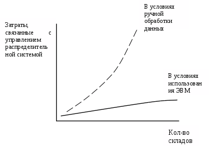Характер данной зависимости представлен на рис. 4.8. Здесь также действует эффект масштаба, в связи с чем при увеличении количества складов кривая расходов на системы управления делается более пологой.