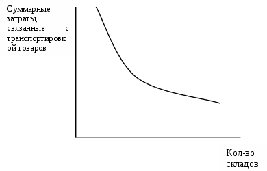 Другая часть транспортных расходов — стоимость доставки товаров со складов потребителям, с увеличением количества складов снижается. Это происходит в результате резкого сокращения пробега транспорта.