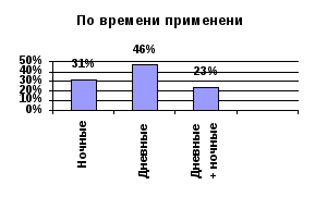 Исследования потребительских предпочтений по времени применения показали, что большая часть потребителей (46%) пользуются дневными кремами. Меньшую долю, как и в структуре ассортимента, составляют кремы ночные — 31%. Дневные и ночные кремы используют женщины старшего возраста. В результате анализа выявлено, что ассортимент по времени применения этой продукции потребителями и фактическая структура рынка полностью идентичны.