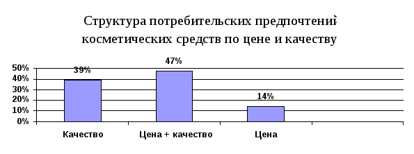 Наиболее важным в изучении любого рынка, в том числе и косметического, является исследование потребительских предпочтений в отношении качества и цены товара. Эти две характеристики находятся в постоянном взаимодействии, и цена часто определяется качеством. В то же время для косметических средств характерно увеличение цены за счет имиджа косметических фирм, которое может доходить до нескольких десятков раз. Долгое время сохранялось мнение, что спрос на товары на российском рынке, в том числе косметические, определяется их ценой вследствие низкой платежеспособности населения.