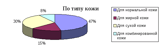 При изучении структуры ассортимента кремов по типу кожи было выявлено, что около половины ассортимента составляют кремы для нормальной кожи. Несколько меньшую долю составляют кремы для сухой (30%) и жирной (15%) кожи (рис. 2.5.). Анкеты по опросу в приложении 2.