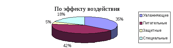 Ассортимент средств для ухода за кожей лица подразделяют также по эффекту действия на питательные, увлажняющие, защитные и специальные. Исследования показали (рис. 2.6.), что наибольшая доля в ассортименте (42%) приходится на питательные кремы, меньшая (35%) — на увлажняющие. Специальные средства (кремы для массажа, депилятории, отбеливающие, антицеллюлитные и т.д.) составляют 18%. К защитным кремам (их доля всего 5%) относятся солнцезащитные, средства после загара, защищающие от вредного воздействия щелочей, моющих средств и т.д. Последняя группа включает в себя и кремы для рук. Ожидается, что ассортимент защитных средств будет расширяться. Их употребление часто зависит от информированности потребителя, внимательного отношения людей к своему здоровью, от рекламы и других факторов, роль которых в настоящее время еще незначительна.