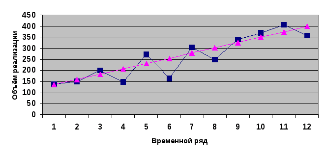 Анализируя построенные графики можно сделать сказать, что расчетные данные прогноза практически сохраняют ту же тенденцию развития, что и реальные данные об объемах реализации.
