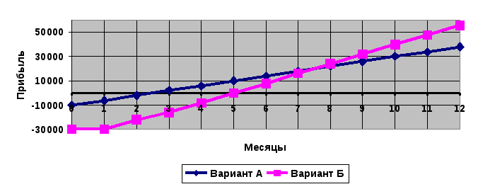 Анализ показывает, что вариант Б окупается за 2,5 месяца, вариант А за 5 месяцев. Далее вариант Б вообще предпочтительнее в течение 8,5 месяцев, но по окончании этого срока большую прибыль начинает приносить вариант А.