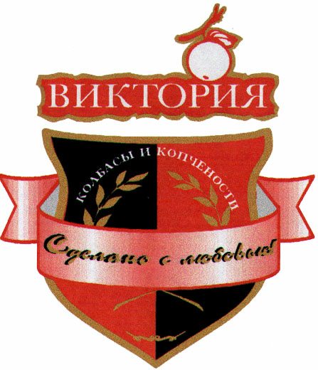 Описание: товарный знак выполнен в виде щита, обвязанного лентой. На ленте надпись-слоган - «Сделано с любовью». Щит исполнен в двух цветах: красном и черном. Он символизируют привязанность традициям, а также защиту качества. Над щитом ставится знак «Виктория».