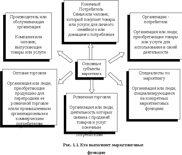 Субъекты маркетинга включают производителей и организации обслуживания, оптовые и розничные торговые организации, специалистов по маркетингу и различных потребителей. Как показано на рисунке 2, у каждого из них своя роль. Важно отметить, что хотя ответственность за выполнение маркетинговых функций может делегироваться и распределяться различными способами, совсем ими в большинстве случаев пренебречь нельзя, они должны обязательно кем-то выполняться.