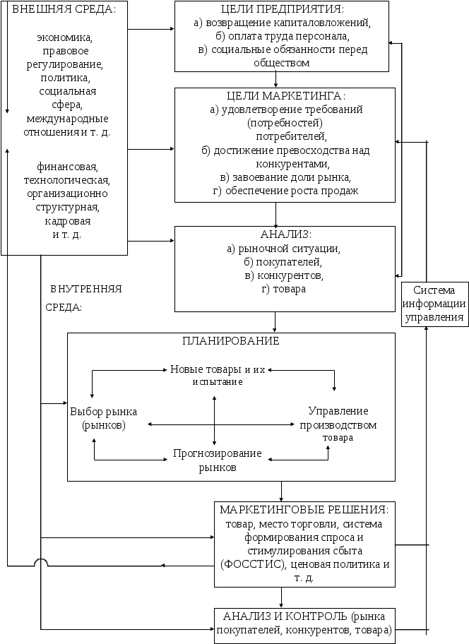 В этих программах заложены мероприятия по улучшению товара и его ассортимента, изучению покупателей, конкурентов и конкуренции, по обеспечению ценовой политики, формированию спроса, стимулированию сбыта и рекламе, оптимизации каналов товародвижения и организации сбыта, организации технического сервиса и расширения ассортимента представляемых сервисных услуг. Маркетинг как порождение рыночной экономики является в определенном смысле философией производства, полностью (от научно-исследовательских и проектно-конструкторских работ до сбыта и сервиса) подчиненной условиям и требованиям рынка, находящимся в постоянном динамическом развитии под воздействием широкого спектра экономических, политических, научно-технических и социальных факторов. Предприятия-производители и экспортеры рассматривают маркетинг как средство для достижения целей, фиксированных на данный период по каждому конкретному рынку и его сегментам, с наивысшей экономической эффективностью. Однако это становится реальным тогда, когда производитель располагает возможностью систематически корректировать свои научно-технические, производственные и сбытовые планы в соответствии с изменениями рыночной конъюнктуры, маневрировать собственными материальными и интеллектуальными ресурсами, чтобы обеспечить необходимую гибкость в решении стратегических и тактических задач, исходя из результатов маркетинговых исследований. При этих условиях маркетинг становится фундаментом для долгосрочного и оперативного планирования производственно-коммерческой деятельности предприятия, составления экспортных программ производства, организации научно-технической, технологической, инвестиционной и производственно-сбытовой работы коллектива предприятия, а управление маркетингом - важнейшим элементом системы управления предприятием.