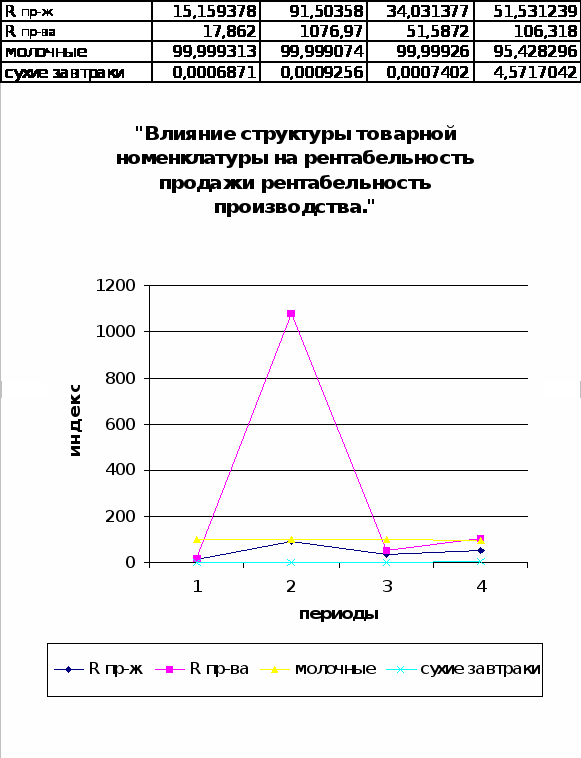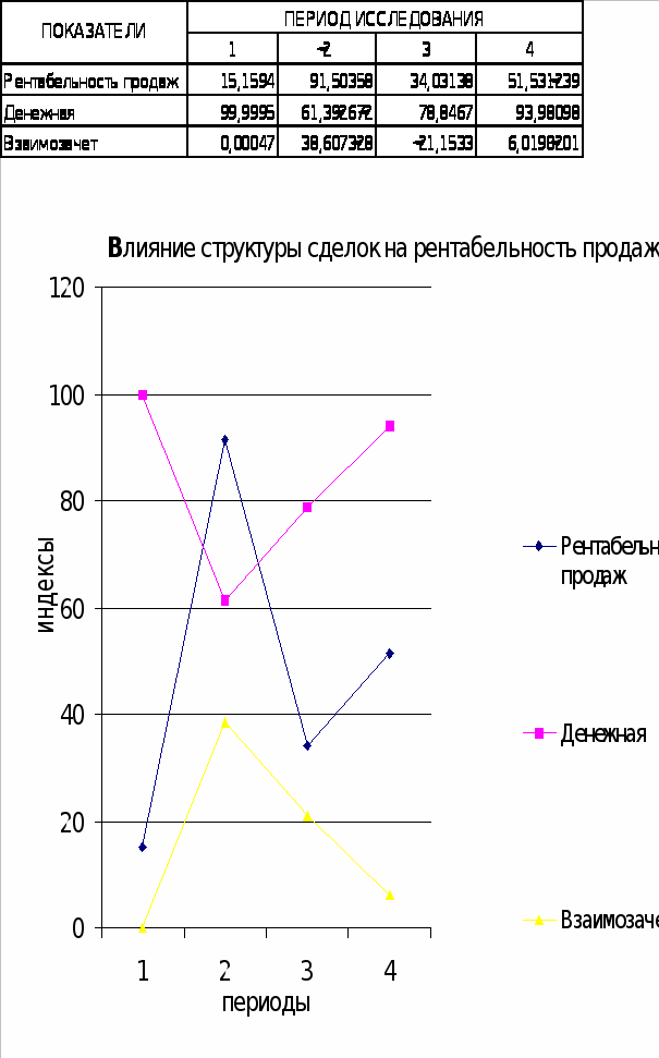 По графику видно, что при повышении сделок по взаимозачету и не большое уменьшение сделок по денежной форме во втором периоде фирма достигла наибольшего числа рентабельности продаж. Но как только снизились сделки по взаимозачету, а денежные наоборот возросли, рентабельность продаж в третьем периоде снизилась. Однако в четвертом периоде фирма продолжала все меньше использовать сделки по взаимозачету, а больше стала использовать денежные сделки. При этом рентабельность продаж стала расти.