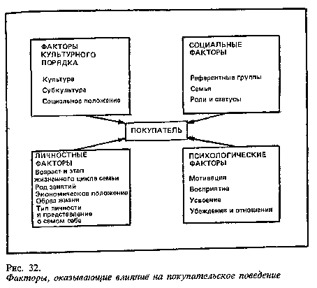 Характеристики покупця. Споживачі приймають свої рішення не у вакуумі. На чинені ними покупки великий вплив роблять фактори культурного, соціального, особистого і психологічного порядку (див. мал. 4). Здебільшого це фактори, що не піддаються контролю з боку діячів ринку. Але їх обов'язково варто взяти до уваги.