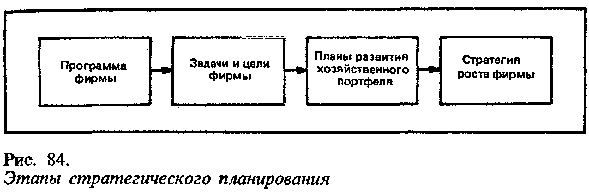 Стратегічне планування - це управлінський процес створення і підтримки стратегічної відповідності між цілями фірми, її потенційними можливостями і шансами в сфері маркетингу. Воно спирається на чітко сформульовану програмне подання фірми, виклад допоміжних цілей і задач, здоровий господарський портфель і стратегію росту. Етапи стратегічного планування представлені на мал. 1, а їхній опис дається нижче.