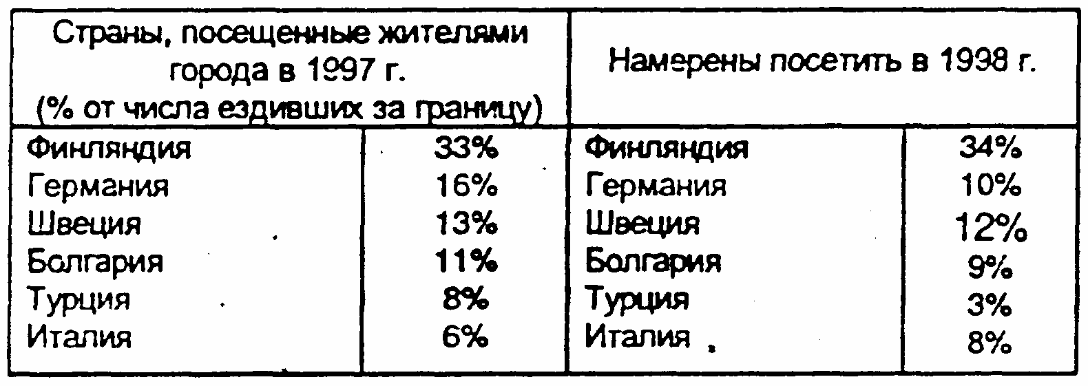 Например, какая-нибудь мелкая фирма, которая не может провести собственное исследование, захотела узнать данные о посещаемости стран туристами Санкт-Петербурга. Газета «На Невском» публикует данные исследования, которое проводилось компанией «Топ-Опинион» в декабре 1997 года:
