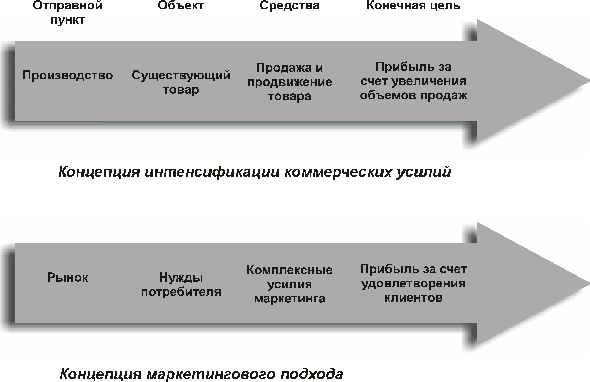 Для того, чтобы понять отличие предприятий со сбытовой и маркетинговой из существующих пяти концепций управления маркетингом рассмотрим две: интенсификацию коммерческих усилий и маркетинговый подход.