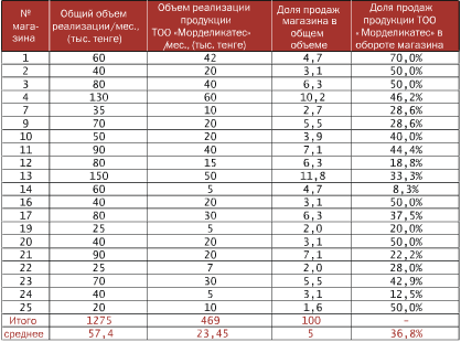 Разработка соответствующих стимулирующих программ и мероприятий поддержки позволит добиться увеличения доли продукции ТОО "Морделикатес"в обороте магазинов, в которых он значительно ниже - например, до уровня 36,8 %, а следовательно доля рынка ТОО "Морделикатес" соответственно увеличится на 5,5% и составит 38,2% (Таблица 2.).