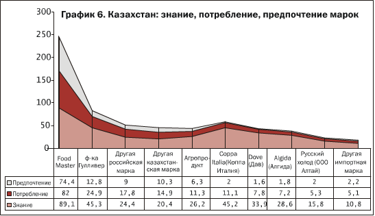 Казахстанский рынок мороженого достаточно разнообразен в предложении, однако абсолютным лидером пока является "Food Master", за ним стоит российская фабрика "Гулливер". Другие казахстанские марки, включая "Агропродукт", обосновались на четвертом и пятом местах. Положение марки "Coppa Italia" следующее: знание достаточно высокое - 45,2%, а вот потребление и предпочтение совсем низкое. То же самое происходит и с такими брендами, как "Dove" и "Algida.