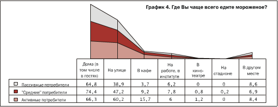 Места, где в основном едят мороженое, не столь уж разнообразны. Это прежде всего дом, улица, кафе. В последнее время актуализировались такие несколько подзабытые места как стадион и кинотеатр. Производителям и дистрибьюторам мороженого можно было бы посоветовать обратить внимание на "новые - старые" места потребления и выставлять именно там свои лотки-холодильники. Распределение в цифровом выражении вы можете посмотреть на графике №4.