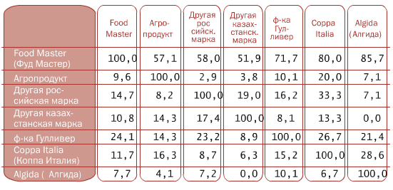 24,1% потребителей, предпочитающих марку "Food Master", употребляют и мороженое фабрики Гулливер. 57,1% предпочитающих "Агропродукт" едят и "Фуд Мастер", и т.д.
