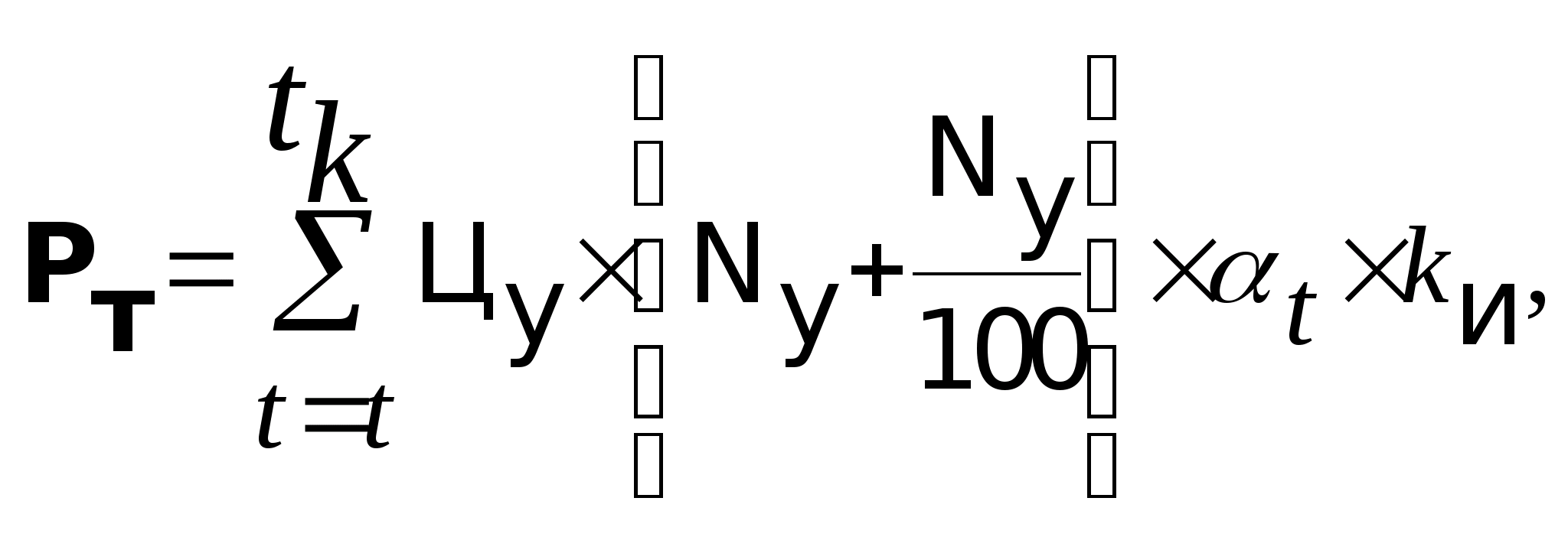 где t>н> - начальный год расчетного периода; t>к> - конечный год расчетного периода; t- год, затраты и результаты которого приводится к расчетному году; Ц>у> - цена реализации услуг; а>t> - коэффициент приведения одновременных затрат и результатов к расчетному году; к>и> - коэффициент, учитывающий инфляцию по годам расчетного периода; N>у> - программа выпуска услуг в год, предыдущему расчету (N>у> = 1 855 услв.)