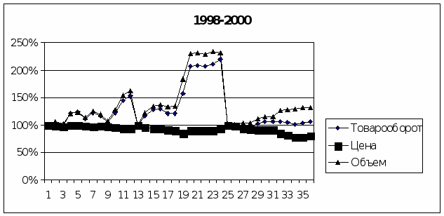 Анализ конъюнктуры рынка показывает, что рынок находится на этапе роста, хотя темпы роста в 2000 году снизились по сравнению с 1998, 1999 годами. Анализ цикличности показывает, что объемы продаж в I и II кварталах различаются незначительно, а в III и IV кварталах года наблюдается быстрый рост. Рост товарооборота при одинаковых темпах роста указывает на то, что рынок далек от насыщения и тенденции, благоприятные для фирмы, сохраняются.