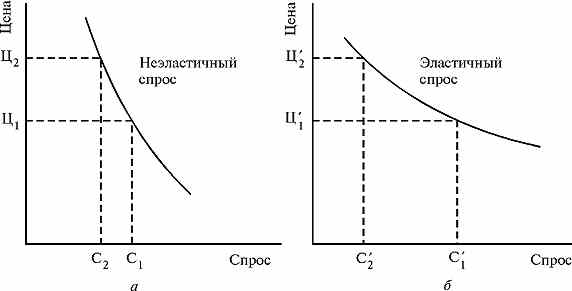 На рис. 1 изображены две кривые спроса, причем увеличение цены от Ц1 до Ц2 (рис. 1а) приводит к относительно слабому падению спроса (от С1 до С2). В этом случае говорят, что спрос является неэластичным. Примером могут служить тарифы на электроэнергию, квартплата за жилье. То же самое увеличение цены на кривой спроса, приведенной на рис. 1б, вызывает значительное падение спроса — это эластичный спрос. Например, цены на товары не первой необходимости — скажем, легковые автомобили. Многие мечтают их купить, и как только снижение цены на подобные товары дает возможность это сделать, покупка совершается. Степень эластичности спроса на изменение цены характеризует коэффициент ценовой эластичности спроса, который определяется как отношение процентного изменения величины спроса к процентному изменению цены. Например, при увеличении цены на 2% спрос упал на 10% — это означает, что коэффициент эластичности спроса равен — 5. (Отрицательный знак означает обратную зависимость между ценой и спросом.) Данный коэффициент, как правило, хотя и не всегда, является отрицательной величиной. С практической точки зрения можно говорить, что если понижение цены вызывает такой рост продаж и оборота, что потери от низких цен с лихвой компенсируются, то спрос квалифицируется как эластичный, если нет, то это свидетельство неэластичного спроса. Ситуация, когда изменение цен никак не влияет ни на спрос, ни на предложение, — верный признак отсутствия рыночных отношений. Таким образом, доход, получаемый от реализации товаров с эластичным спросом, в ряде случаев может быть повышен при снижении в определенных пределах цены на эти товары.
