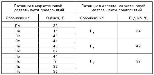 Приведенные в таблице результаты свидетельствуют о крайне низком использовании потенциалов по различным направлениям маркетинговой деятельности предприятий. Так, практически невостребованными являются потенциалы маркетинговых информационных систем (15%) и инструментов стимулирования сбыта продукции предприятий (9%).