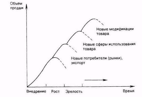 Необходим поиск дополнительных рынков для нового товара и новых пользователей. Предприятие разрабатывает систему поощрения более частых покупок товара теми покупателями, которые его уже приобрели. Параллельно проводится работа по нахождению способов более разнообразного использования товара и новых сфер применения. Различные способы продления ЖЦТ показаны на рисунке.