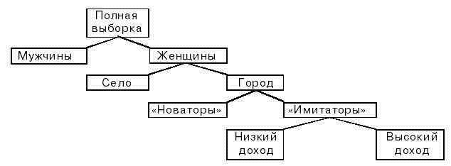 На рис. 2 представлена схема последовательных разбивок по методу AID (автоматического детектора взаимодействия), который получил широкое распространение в процедурах сегментации. Подобные методы перебора вариантов достаточно часто используются при сегментации рынка. Например, в исследовании Карпова [3] подобный подход предложен как приоритетный метод выбора целевого рынка.