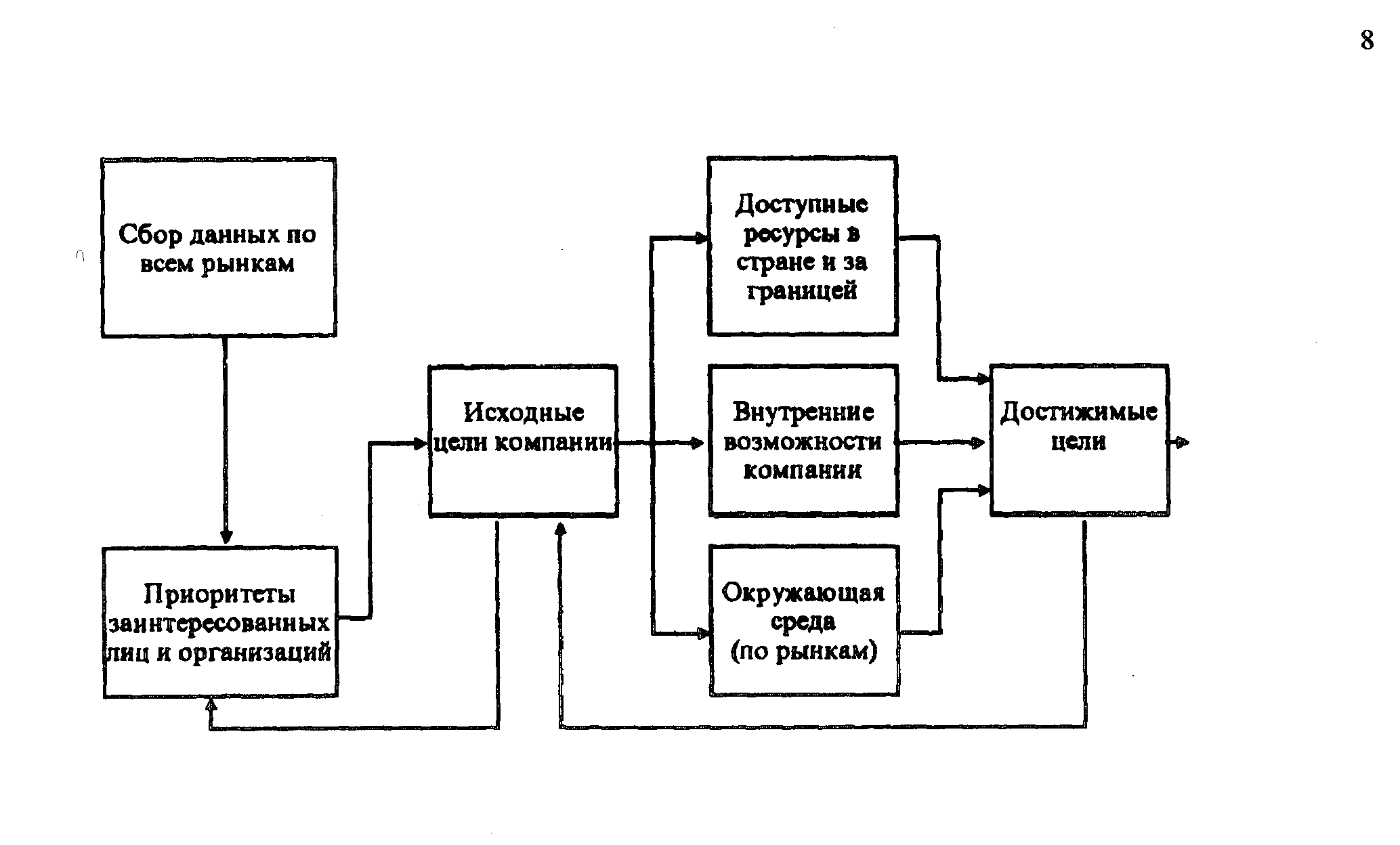 Процесс планирования в компании начинается с определения исходных целей ее развития и деятельности, в основу разработки которых многие компании кладут цели-миссии (рис. 1). По сути дела цели-миссии, или главные стратегические цели, — это видение того, что из себя должна представлять компания или за что она должна бороться. В них должны быть отражены интересы всех групп влияния (акционеры, менеджеры, сотрудники и рабочие, поставщики, банки, правительственные учреждения, местные органы управления, общественные организации и др.). Цели-миссии должны подчеркивать социальную значимость компании и служить средством консолидации и мотивации персонала компании. Интересы заинтересованных лиц и организаций (групп влияния) учитываются также при выработке исходных целей компании.