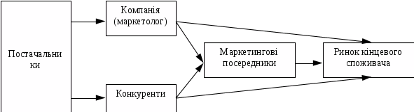 На рисунку 1.1 показані основні елементи системи сучасного маркетингу. У стандартній ситуації маркетинг повинен обслуговувати ринок кінцевих споживачів в умовах наявності конкуренції. Компанія та її конкуренти відправляють вироблену ними продукцію й інформацію про неї кінцевим споживачам – особисто чи через проміжні ланки (посередників). На всі діючі елементи цієї системи впливають однакові фактори навколишнього середовища (демографічні, економічні, екологічні, науково-технічні, політико-правові, соціально-культурні). Кожна зі складових системи маркетингу вносить свій внесок у створення споживчої цінності. Таким чином, успіх компанії залежить не тільки від її власних дій, але і від того, наскільки добре потреби кінцевого споживача задовольняються всіма ланками ланцюга.