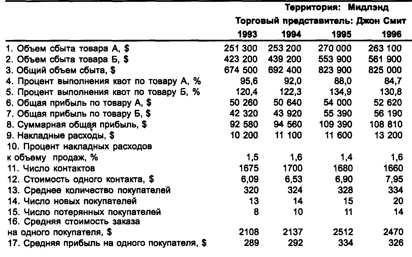 Анализ данной таблицы позволяет торговому менеджеру всесторонне оценить результаты деятельности его подчиненного Джона Смита. Общий объем продаж Смита увеличивался с каждым годом (строка 3), однако рост показателя отнюдь не означает, что его работа с каждым годом улучшается. Разбивка по видам продукции показывает, что ему удалось значительно увеличить сбыт продукции типа Б по сравнению с продукцией типа А (строки 1 и 2). Основываясь на показателях выполнения торговых квот (строки 4 и 5), правомерно предположить, что успех в продаже товара Б достигнут за счет снижения продаж товара А. По показателю общей прибыли (строки 6 и 7) видно, что компания получает большую выгоду от продажи товара А. Очевидно, Смит усиленно продает более ходовой и менее прибыльный товар Б. Хотя в период с 1995 по 1996 г. общий уровень продаж увеличился на $ 1,1 тыс. (строка 3), уровень прибыли за тот же период снизился на $ 580 (строка 8).