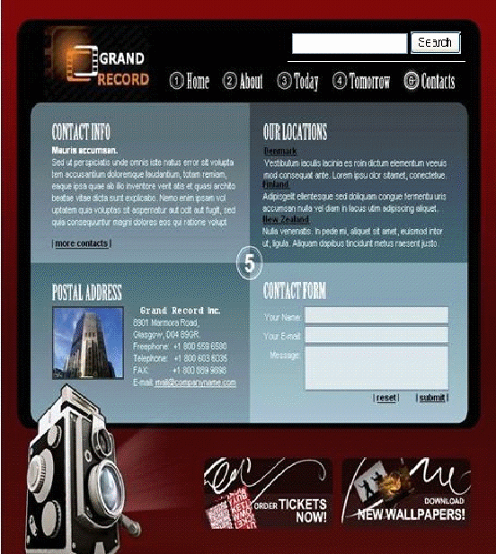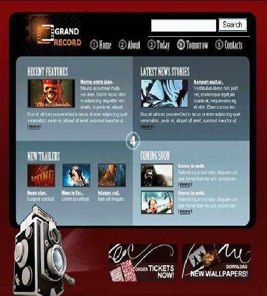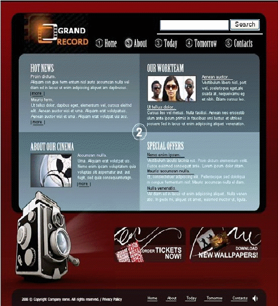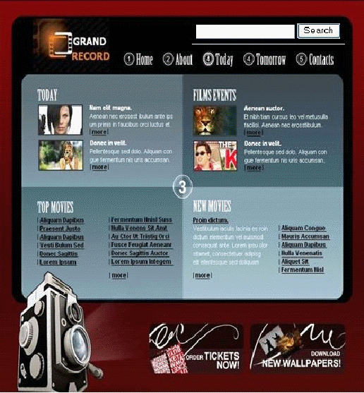 Website of Grand Record cinema is based on Golden Screen Cinema website (www.gsc.com. my). It includes 5 main pages which are “Home", “About", “Today", “Tomorrow" and “Contacts”, and also it has two direct accesses to Order Tickets Online and Download New Wallpapers.