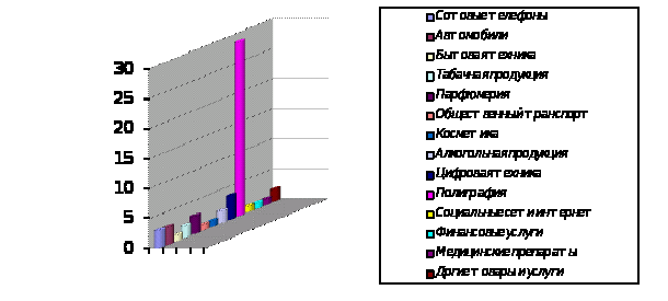 Безусловным лидером по частоте упоминания является полиграфическая продукция, это, от части, обусловлено тем, что в журнале есть раздел, специально посвященный рекламе полиграфической продукции.