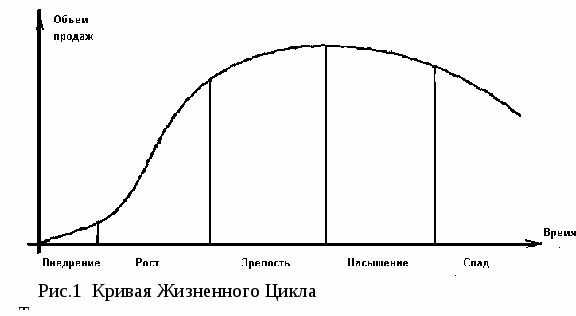 Жизненный цикл товара может быть представлен как определенная последовательность стадий существования его на рынке, имеющая определенные рамки. Динамика жизни товара показывает объем продаж в каждое определенное время существования спроса на него. Графически кривая ЖЦТ может быть представлена так (рис.1):