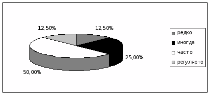 В ходе исследования было выявлено, что 50% респондентов часто занимаются стиркой, 25% - иногда, по 12,5% приходится на тех респондентов, которые занимаются стиркой редко либо регулярно. Регулярность занятия стиркой отображена графически на Рисунке 1.