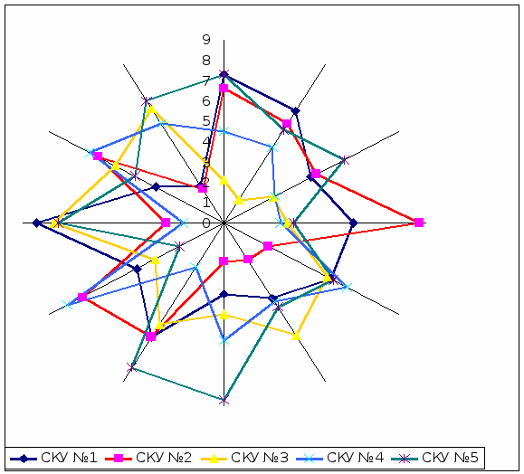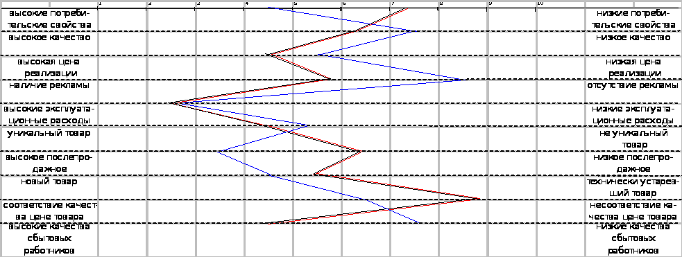 1) на основании исходных данных, представленных в таблице №1 графически отразить профиль товара по отношению к идеальному варианту и товару-конкуренту, используя метод семантического дифференциала;