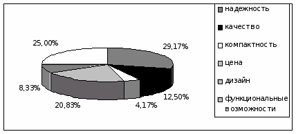 Установлено, что 29,17% респондентов при выборе стиральной машины руководствуются ее надежностью, 25% - функциональными возможностями, для 20,83% респондентов самое главное – цена, 12,5% респондентов самым главным считают качество стиральной машины, 8,33% - дизайн, и наименьшее количество респондентов – 4,17% главным считают компактность стиральной машины.