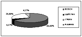 Что касается словосочетания «стиральная машинка», здесь возникли следующие ассоциации: наибольшее число респондентов – 66,66% высказали ассоциацию «BOSCH», что говорит о широкой популярности данной стиральной машины, 25% ассоциируют стиральную машину со стиркой, и по 4,17% приходится на слова «удобство» и «машинка». Диаграмма ассоциаций со словосочетанием «стиральная машина» представлена на Рисунке 7.